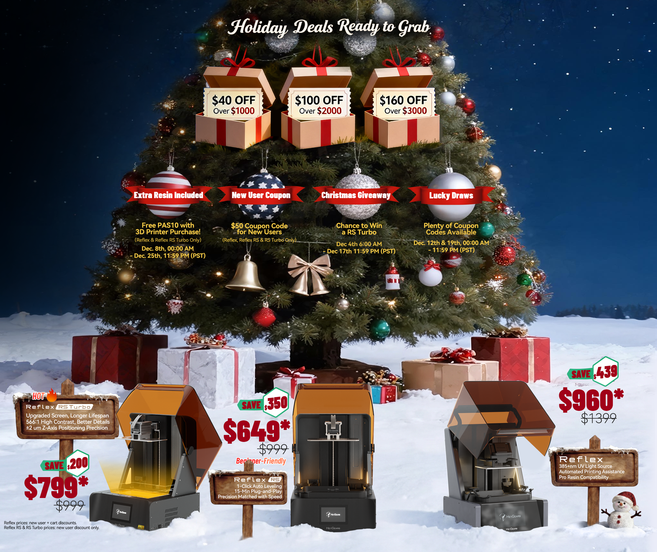 The Holiday Sale runs from December 8th, 00:00 AM - December 25th, 11:59 PM (PST). Customers can enjoy up to $663 off on all 3D printer combos, including a $50 new user coupon applicable to 3D printers or combos.