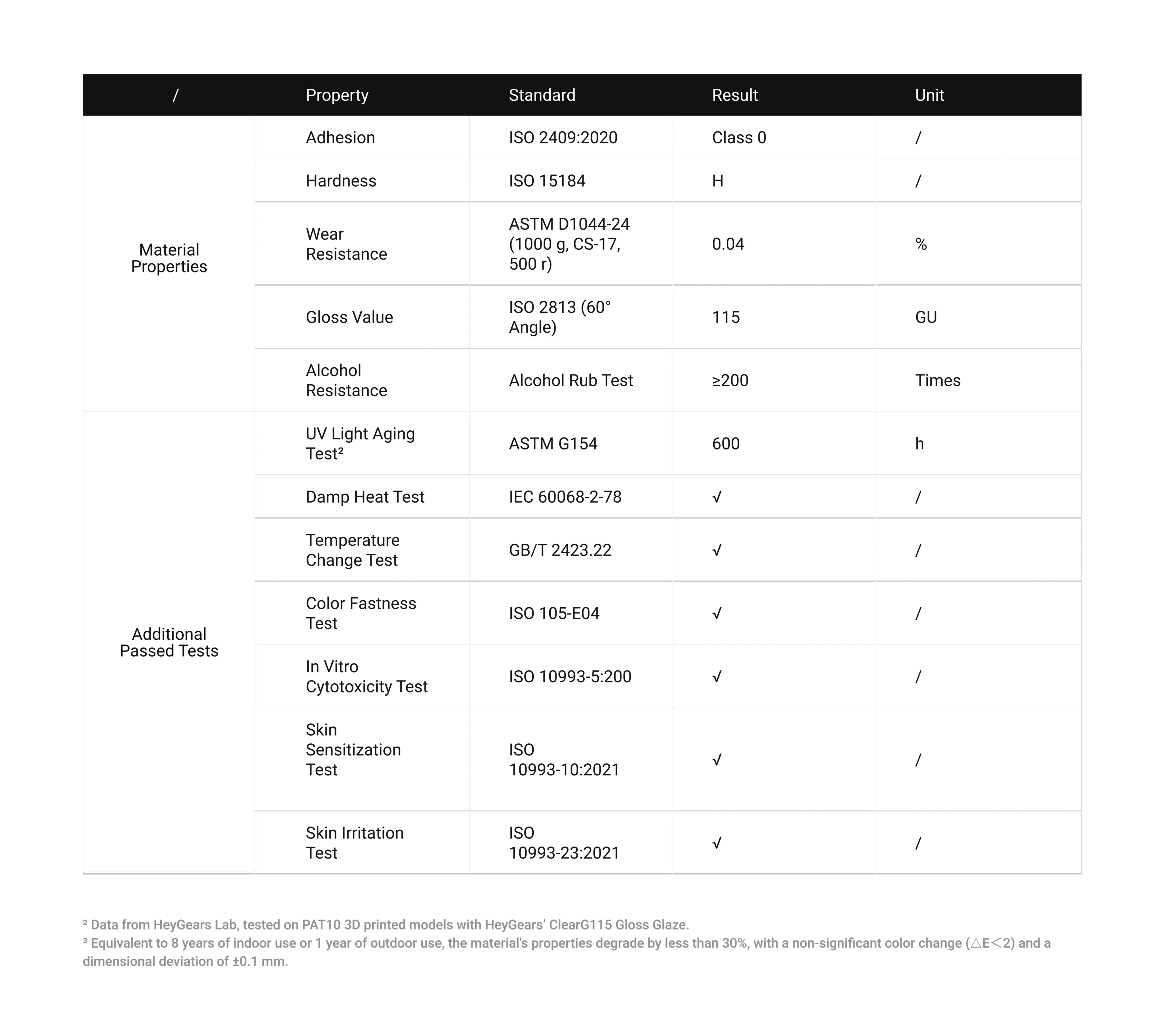 ¹ Data from HeyGears Lab. The material results are the average values from testing, with a deviation of ±10%.