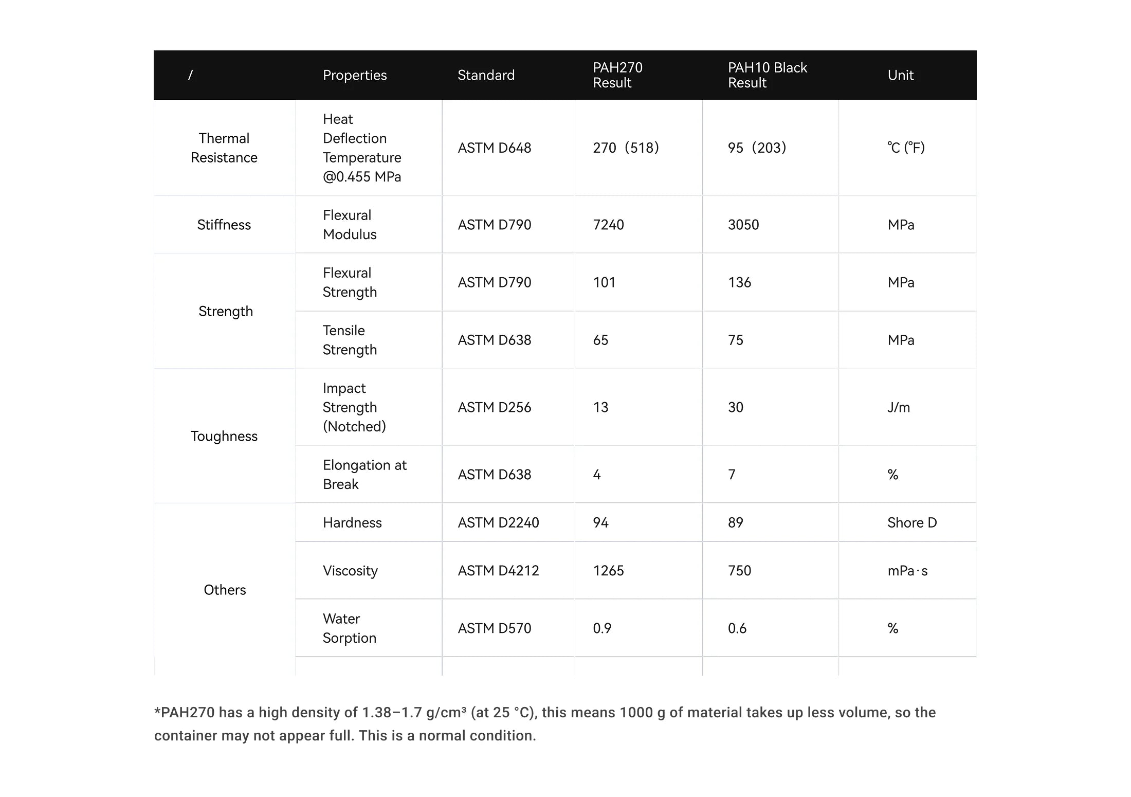 The heat deflection temperature of PAH270 reaches 270 °C at 0.455 MPa, making it ideal for injection molds and heat-resistant parts across various applications, from prototyping to batch production.