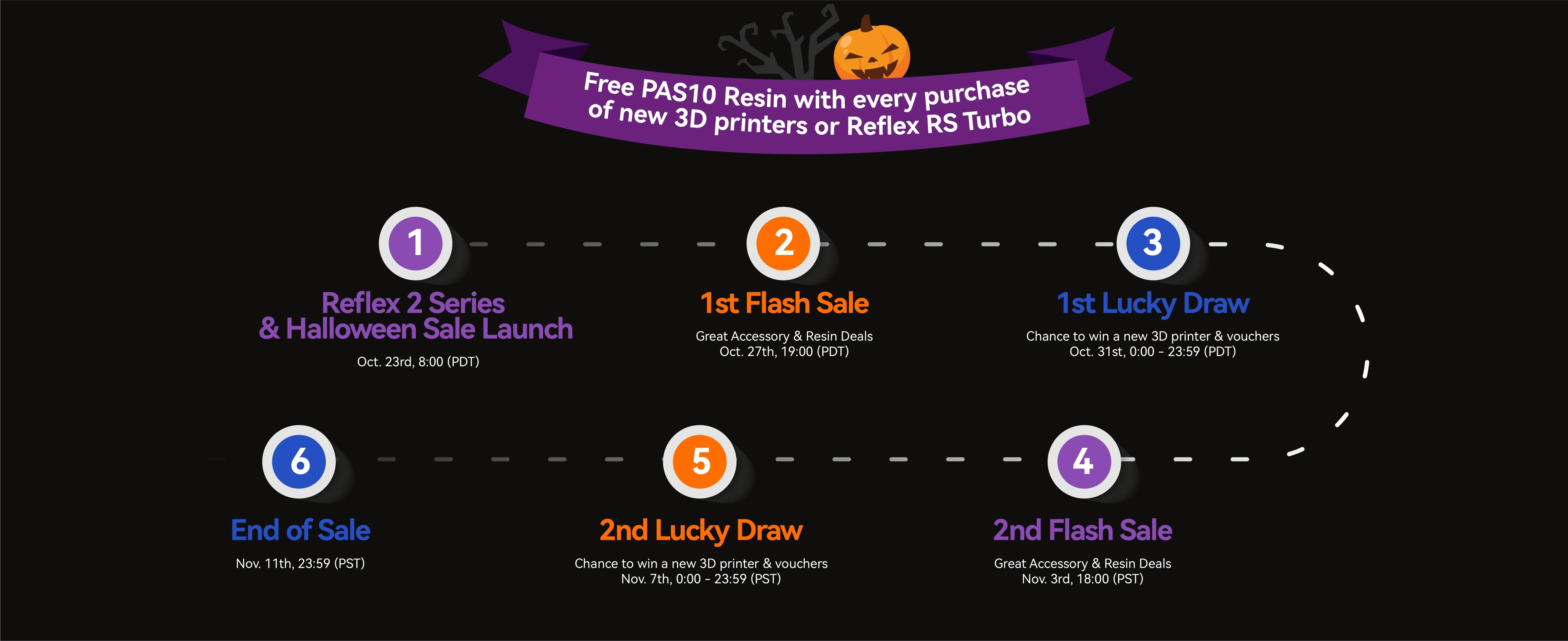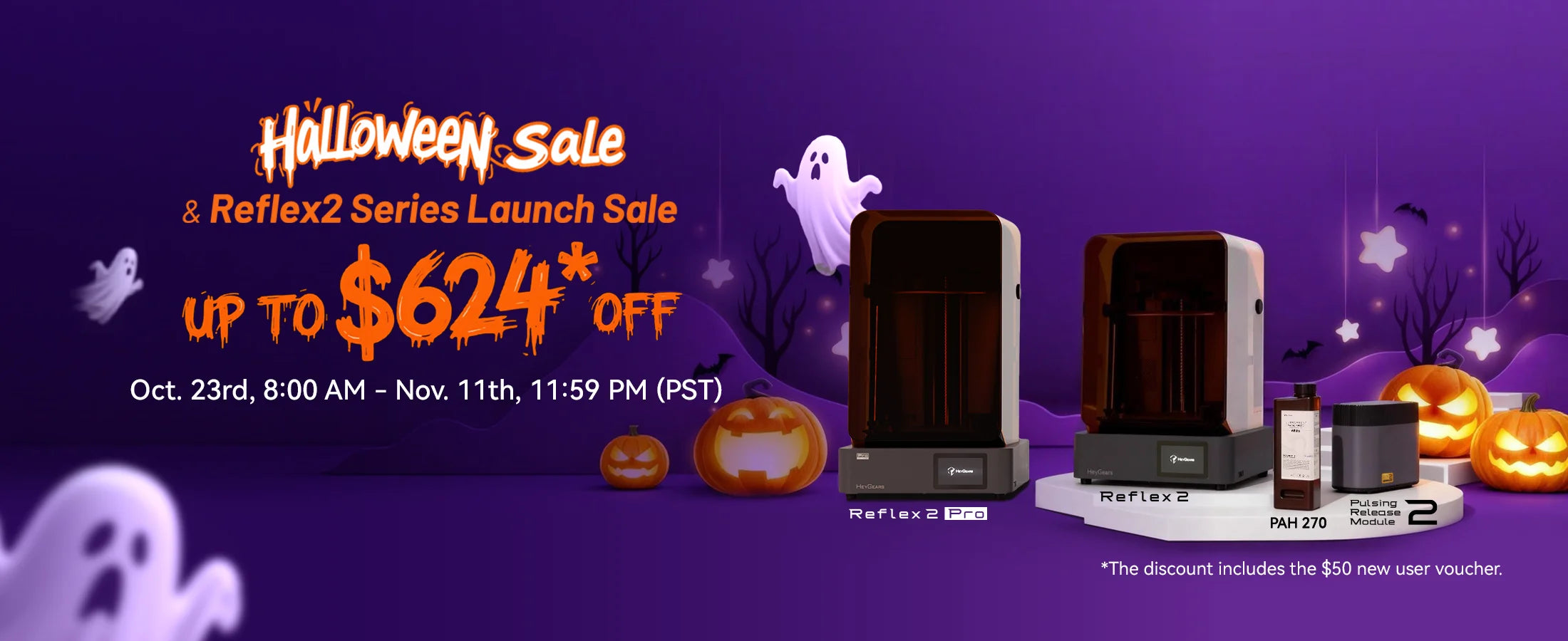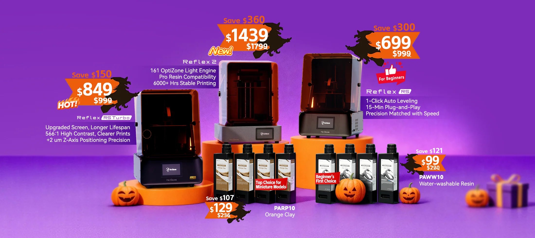 · The sales run from October 23rd, 8:00 to November 11th, 23:59 (PDT), offering discounts up to $624 on new 3D printer combos. Each purchase of a Reflex RS Turbo or Reflex 2 Series 3D printer includes a complimentary bottle of PAS10 resin.
