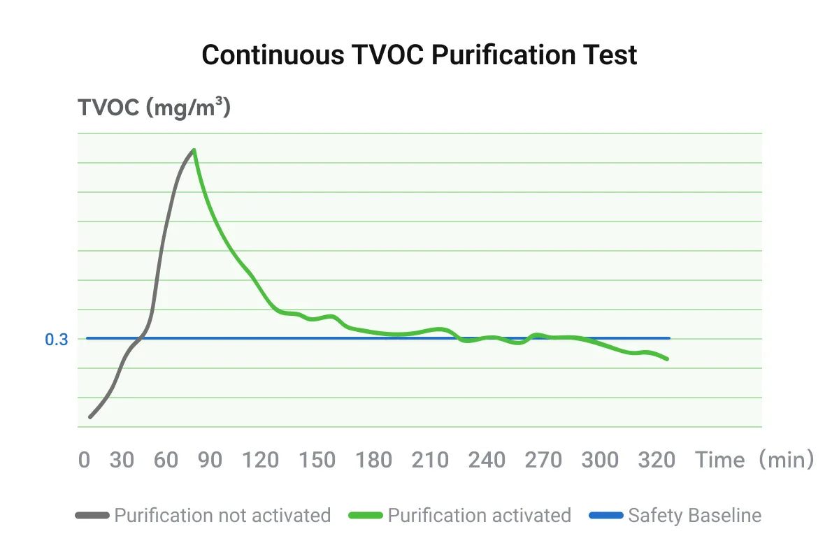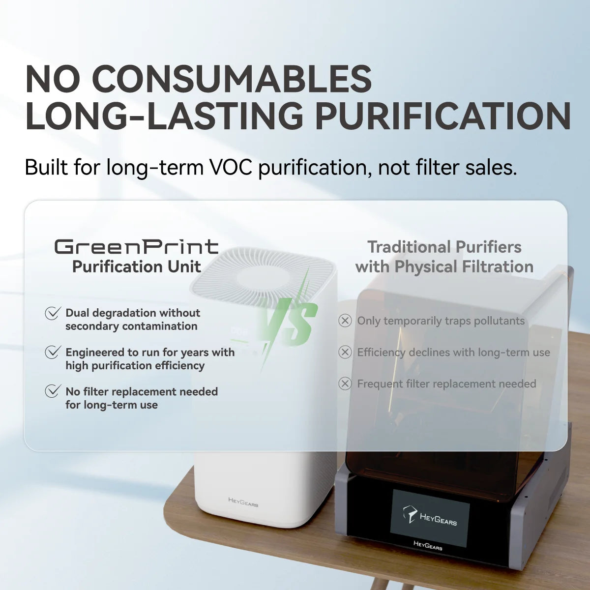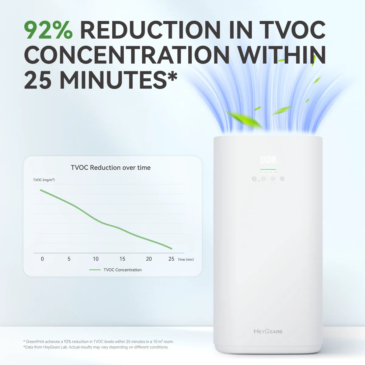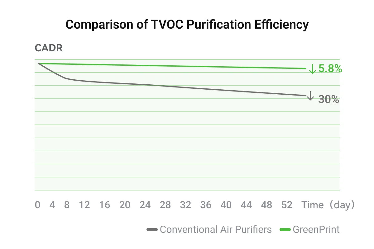 *Data sourced from HeyGears Lab. The efficiency of GreenPrint's photocatalytic filtration normally stabilizes after a period of use. Actual results may vary based on different usage conditions.